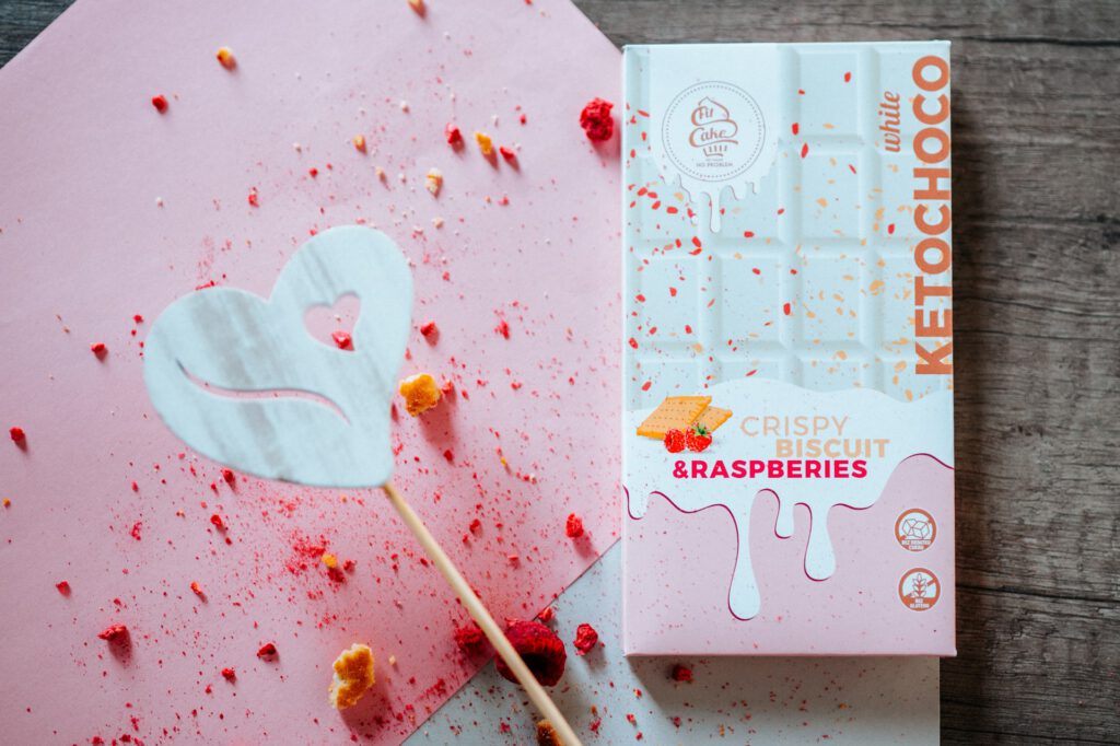 Cocoa fat, whole milk powder 25%, sweetener (erythritol 13.1%, stevia 0.015%), defatted milk 10% powder, inulin, emulsifier (sunflower lecithin), natural vanilla flavouring, keto FIT CAKE* biscuits, freeze-dried raspberries.