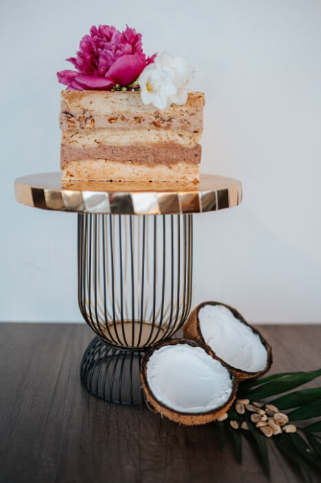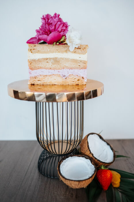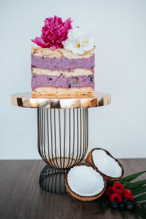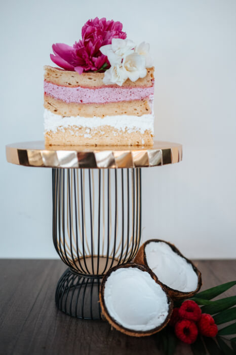 Mleczko kokosowe, maliny, jajka, mąka gryczana, wiórki kokosowe, sok z cytryny, substancja słodząca: erytrol.